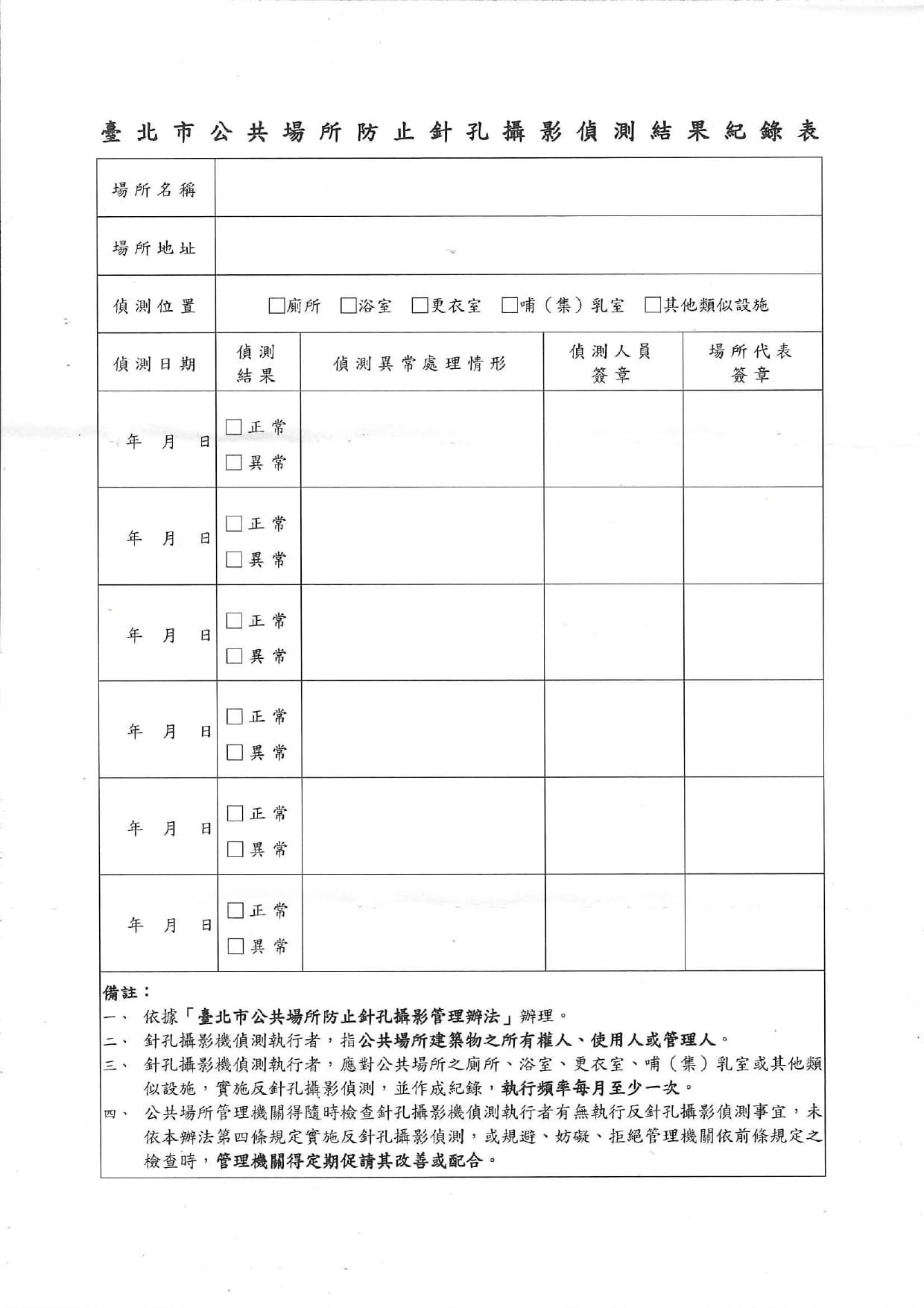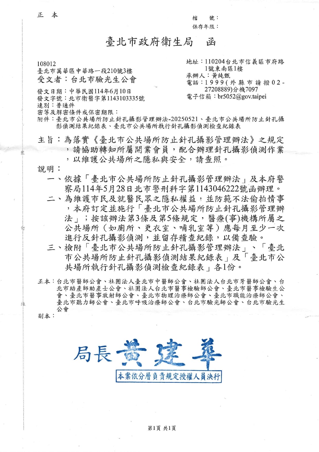 轉知臺北市政府衛生局函(北市衛醫字第1143103335號),為落實《臺北市公共場所防止針孔攝影管理辦法》之規定,請協助轉知所屬開業會員,配合辦理針孔攝影偵測作業,以維護公共場所之隱私與安全。