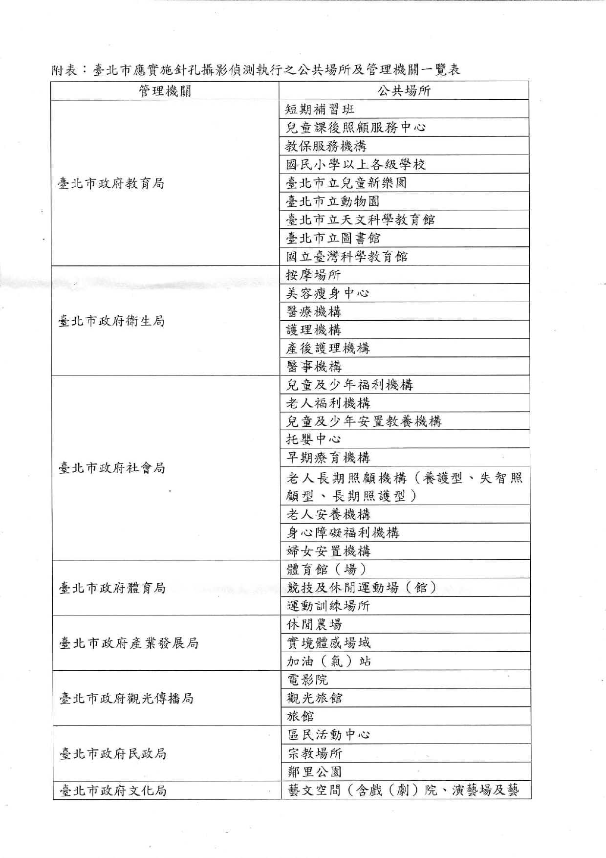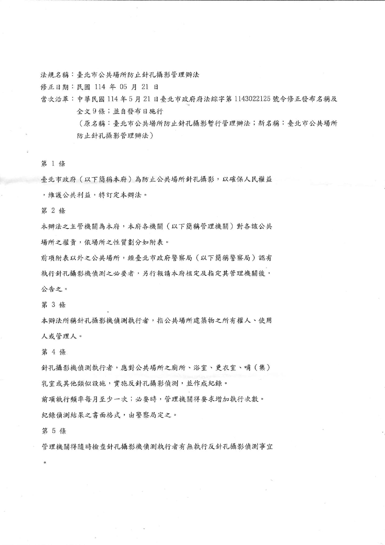 114044-114.06.12-(生)-落實臺北市公共場所防止針孔攝影管理辦法-配合辦理針孔攝影偵測作業函_page-0001.jpg114044-114.06.12-(生)-落實臺北市公共場所防止針孔攝影管理辦法-配合辦理針孔攝影偵測作業函_page-0002.jpg114044-114.06.12-(生)-落實臺北市公共場所防止針孔攝影管理辦法-配合辦理針孔攝影偵測作業函_page-0003.jpg114044-114.06.12-(生)-落實臺北市公共場所防止針孔攝影管理辦法-配合辦理針孔攝影偵測作業函_page-0004.jpg114044-114.06.12-(生)-落實臺北市公共場所防止針孔攝影管理辦法-配合辦理針孔攝影偵測作業函_page-0005.jpg114044-114.06.12-(生)-落實臺北市公共場所防止針孔攝影管理辦法-配合辦理針孔攝影偵測作業函_page-0006.jpg114044-114.06.12-(生)-落實臺北市公共場所防止針孔攝影管理辦法-配合辦理針孔攝影偵測作業函_page-0007.jpg