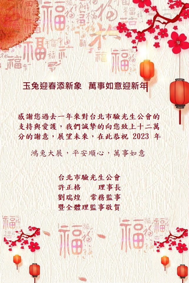 感謝您過去一年來對台北市驗光生公會的支持與愛護,我們誠摯的向您致上十二萬分的謝意,展望未來,在此恭祝2023年鴻兔大展,平安順心,萬事如意!