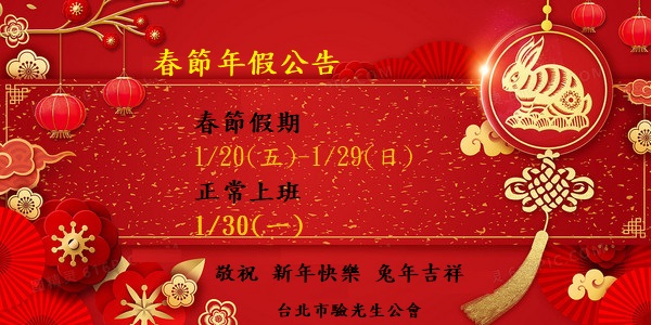 【會務通知】本會於春節年假期間1/20(五)~1/29(日),暫停辦理各項業務,不便之處,敬請見諒。