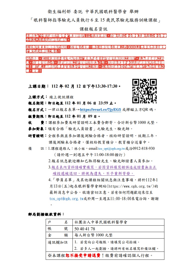 【課程訊息】轉知中華民國眼科醫學會將於112 年 2 月 12 日(日)下午13:30-17:30,辦理「眼科醫師指導驗光人員執行 6 至 15 歲民眾驗光服務訓練課程」