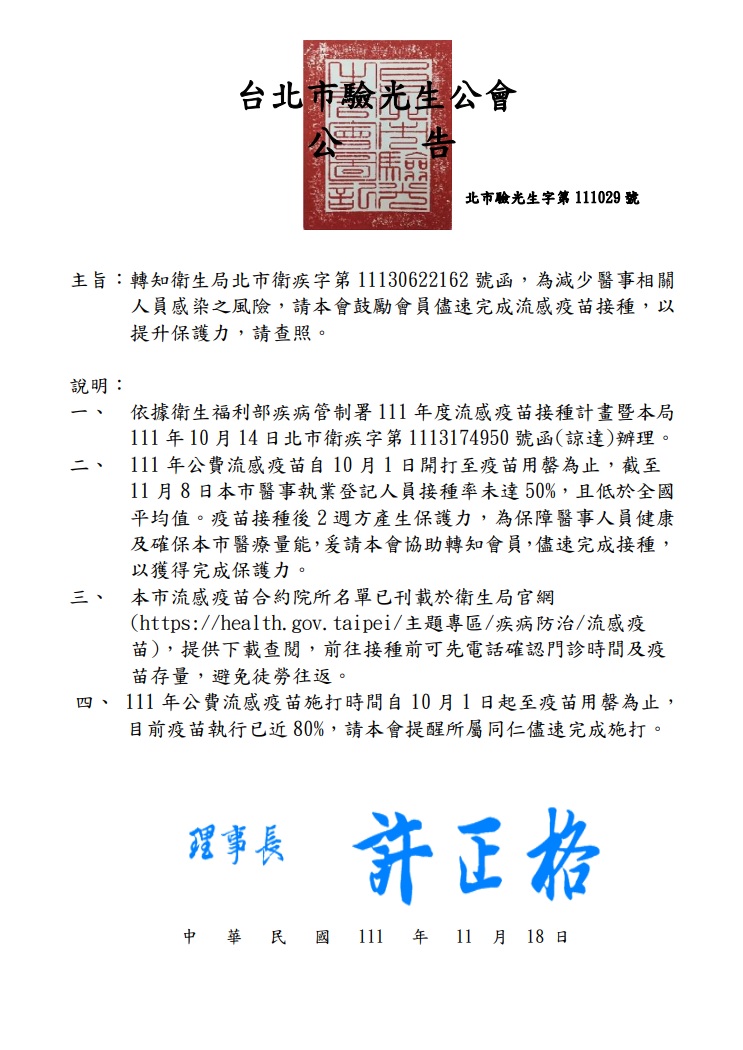 【會員通知】轉知衛生局衛疾醫字第1113174950號函,有鑑於流感疫情持續升溫,為減少醫事相關人員感染風險,請本會鼓勵會員儘速完成流感疫苗接種,以提升保護力。
