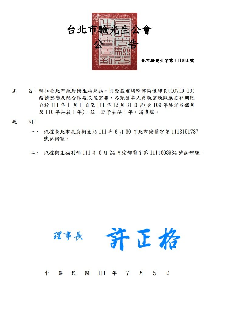 【會員通知】轉知臺北市政府衛生局來函,因受嚴重特殊傳染性肺炎(COVID-19)疫情影響及配合防疫政策需要,各類醫事人員執業執照應更新期限介於111年1 月1 日至111年12月31日者(含109年展延6個月及110年再展1年),統一逕予展延1年,