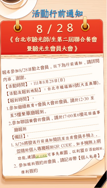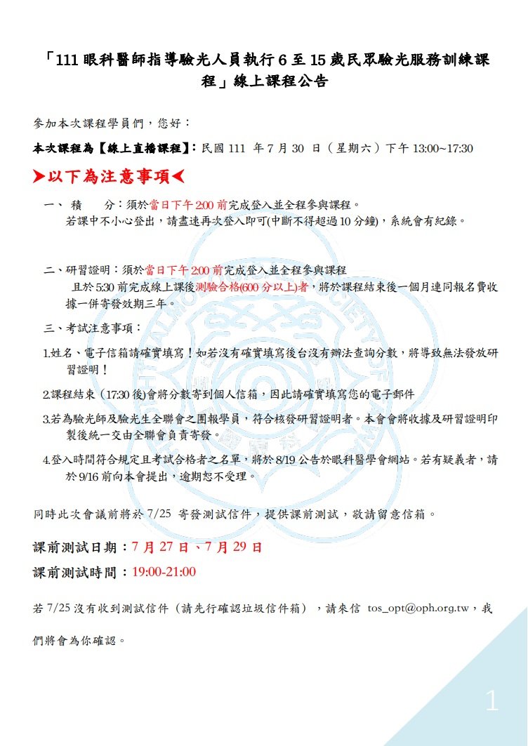 【重要通知】如原本報名驗光師生全聯會聯合辦理之驗光人員執行6-15歲指導課程之會員, 已改為參加上中眼會7/30的線上課程, 敬請留意E-MAIL信箱, 中眼會7/25 將寄發測試信件。