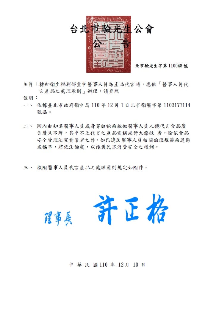 【轉知】衛生福利部重申醫事人員為產品代言時,應依「醫事人員代言產品之處理原則」辦理。