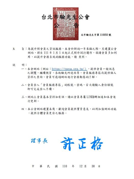 為提升對會員之資訊服務,本會於新的一年來臨之際,另建置公會網站,將自111年1月1日起正式對外試行運作,敬請會員多加利 用,以提升會務系統的服務功能。