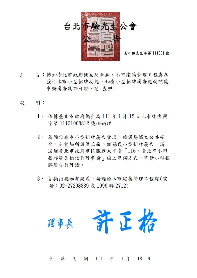 【轉知】臺北市政府衛生局來函,本市建築管理工程處為強化本市小型招牌功能,如有小型招牌廣告應向該處申辦廣告物許可證 ,請 查照。