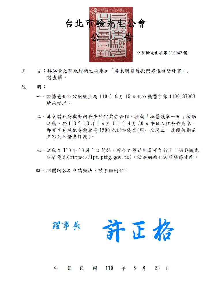 轉知臺北市政府衛生局來函「屏東縣醫護振興旅遊補助計畫」,活動自110年10月l日開始,凡於活動期間入住配合補助計畫之合作旅宿,於住房費用中逕予折抵後,統一由旅宿業者提出補助之申請。