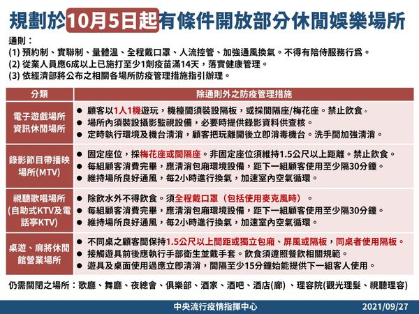 指揮中心規劃於本週起放寬部分場域防疫管制措施,並於10月5日起有條件開放部分休閒娛樂場所