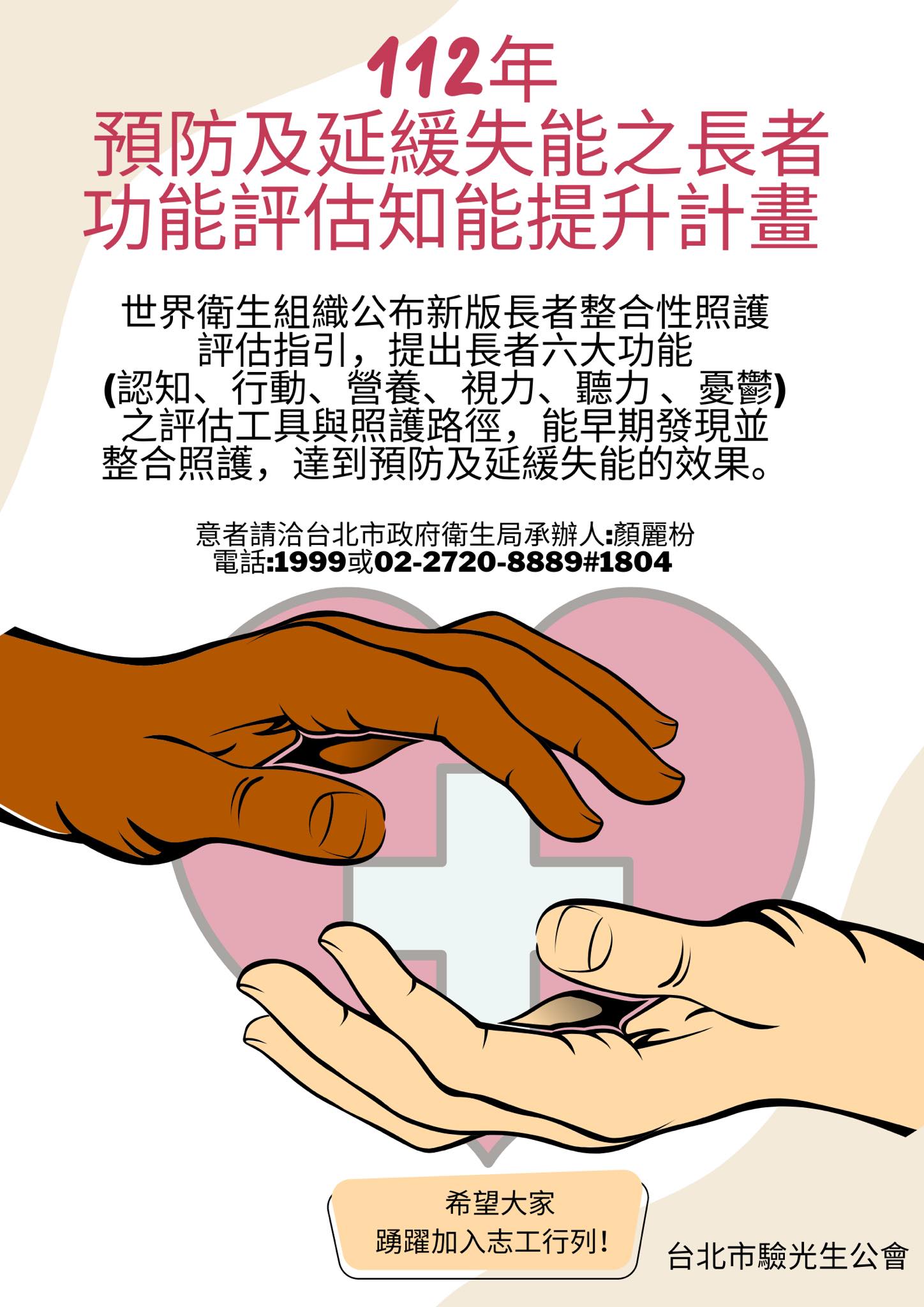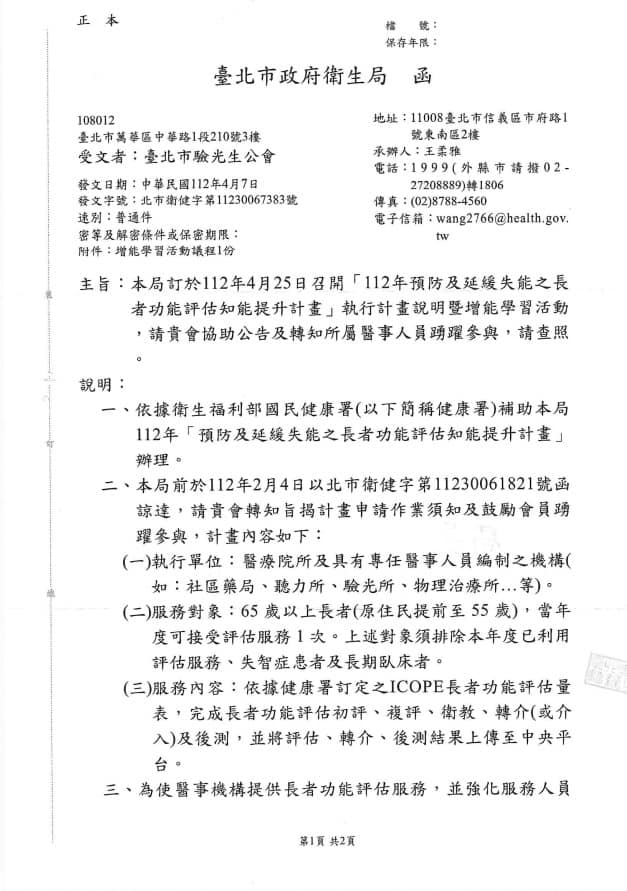 【會員通知】衛生局訂於112年4月25日召開「112年預防及延緩失能之長者功能評估知能提升計畫」執行計畫說明暨增能學習活動