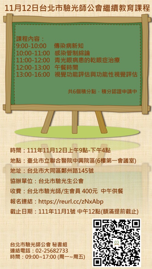 【課程訊息】轉知中華民國眼科醫學會將於112 年 2 月 12 日(日)下午13:30-17:30,辦理「眼科醫師指導驗光人員執行 6 至 15 歲民眾驗光服務訓練課程」