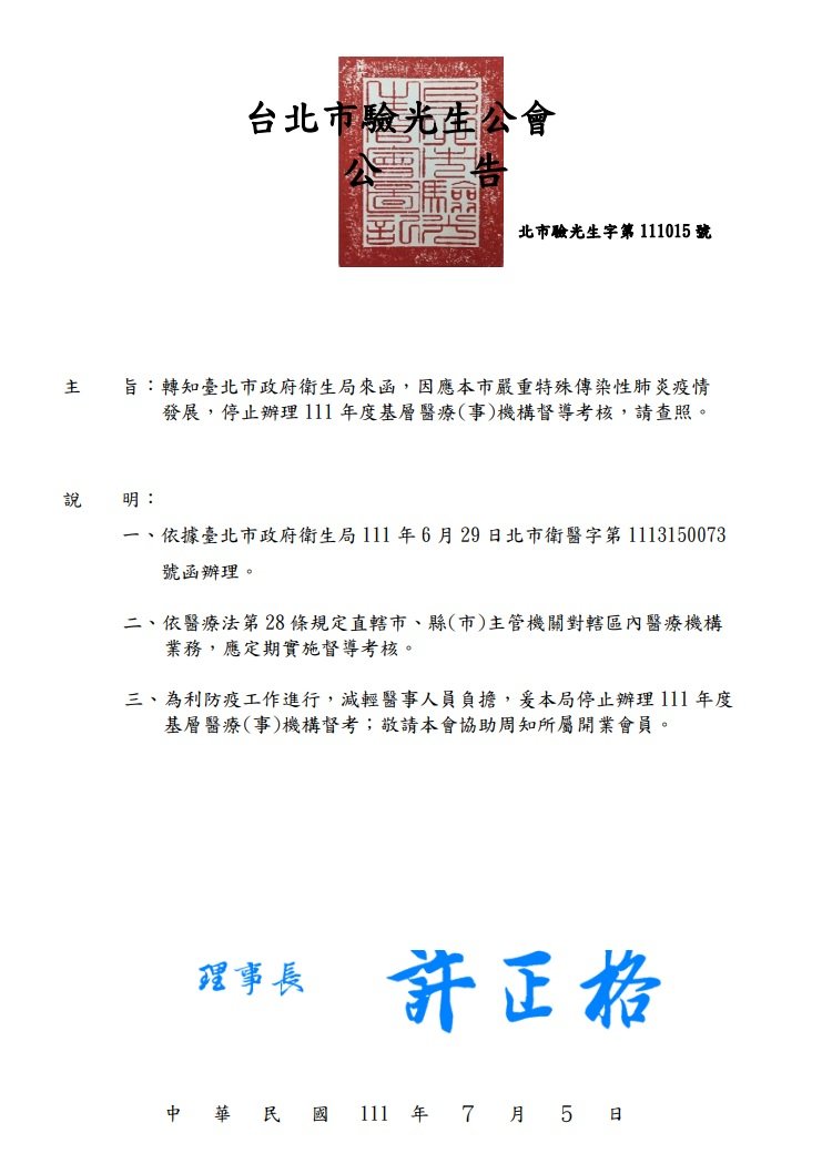 【會員通知】轉知臺北市政府衛生局來函,因應本市嚴重特殊傳染性肺炎疫情發展,停止辦理111年度基層醫療(事)機構督導考核。