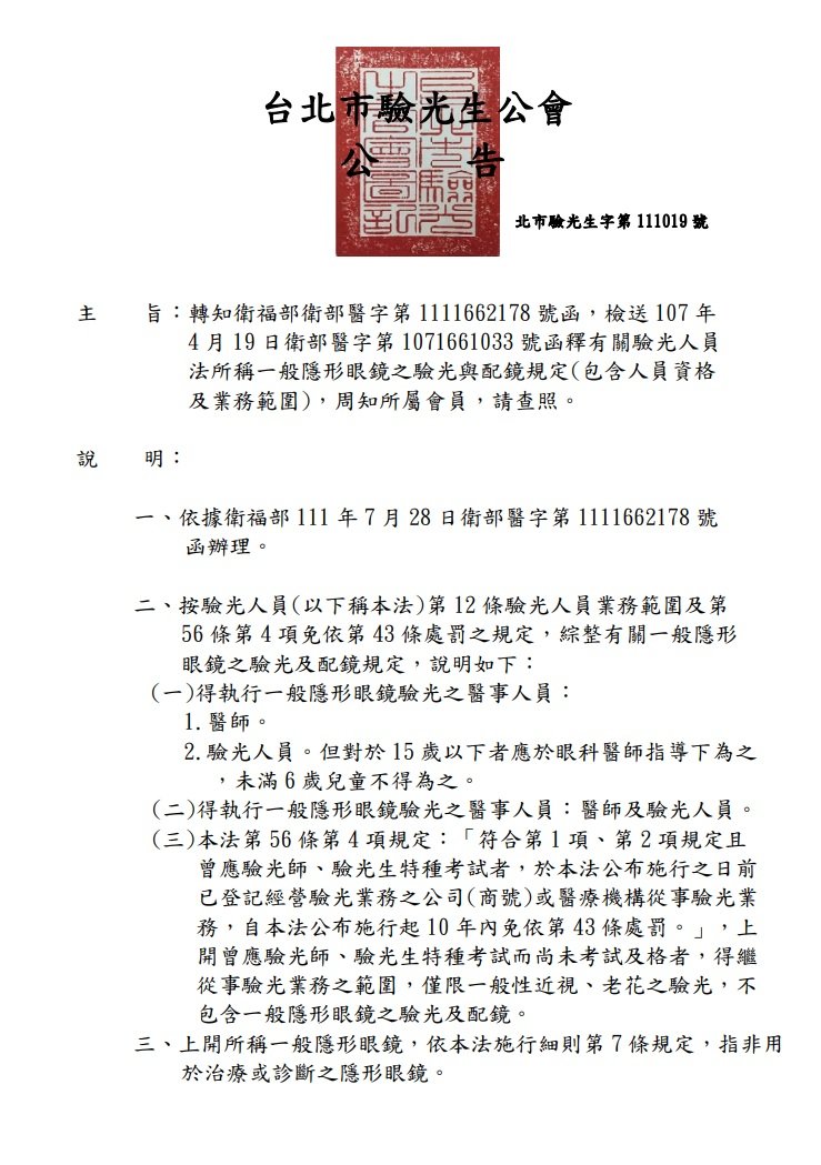 【會員通知】轉知衛福部衛部醫字第1111662178號函,檢送107年4月19日衛部醫字第1071661033號函釋有關驗光人員法所稱一般隱形眼鏡之驗光與配鏡規定(包含人員資格及業務範圍)