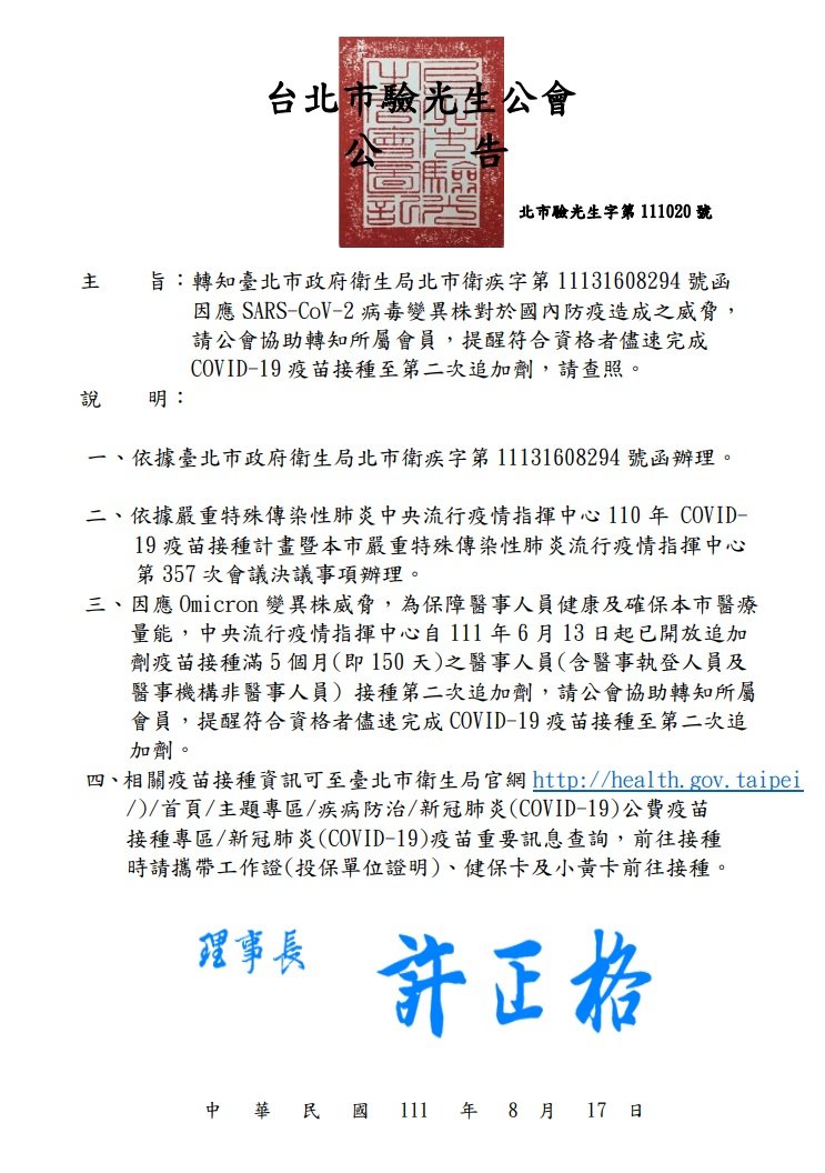 【會員通知】轉知臺北市政府衛生局北市衛疾字第11131608294號函,因應SARS-CoV-2病毒變異株對於國內防疫造成之威脅,請公會協助轉知所屬會員,提醒符合資格者儘速完成COVID-19疫苗接種至第二次追加劑。