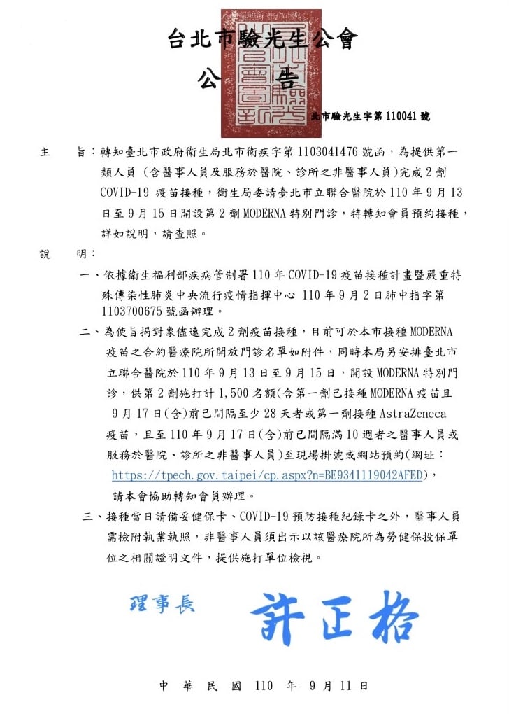 轉知臺北市政府衛生局北市衛疾字第1103041476號函,為提供第一類人員 (含醫事人員及服務於醫院、診所之非醫事人員)完成2劑COVID-19 疫苗接種,衛生局委請臺北市立聯合醫院於110年9月13日至9月15日開設第2劑MODERNA特別門診,特轉知會員預約接種,詳如說明,請查照。