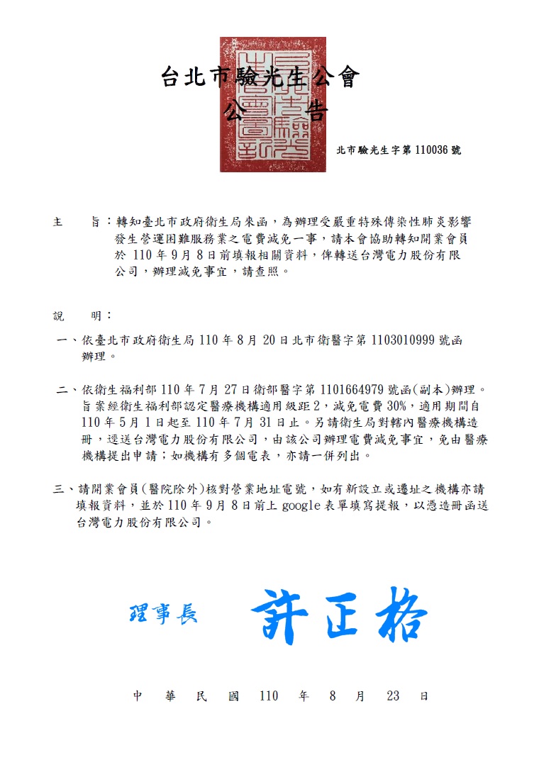 轉知臺北市政府衛生局來函,為辦理受嚴重特殊傳染性肺炎影響發生營運困難服務業之電費減免一事,請本會協助轉知開業會員於 110年9月8日前填報相關資料,俾轉送台灣電力股份有限公司,辦理減免事宜,請查照。