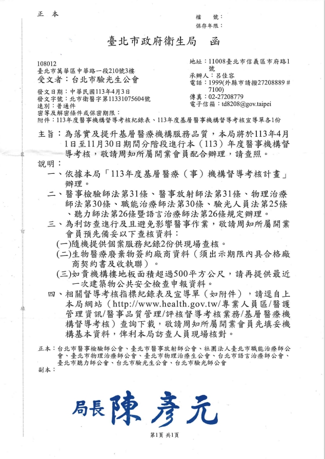 【會員通知】為落實及提升基層醫療機構服務品质,台北市衛生局將於113年4月1日至11月30日間進行本(113)年度基層醫療機構督導考核
