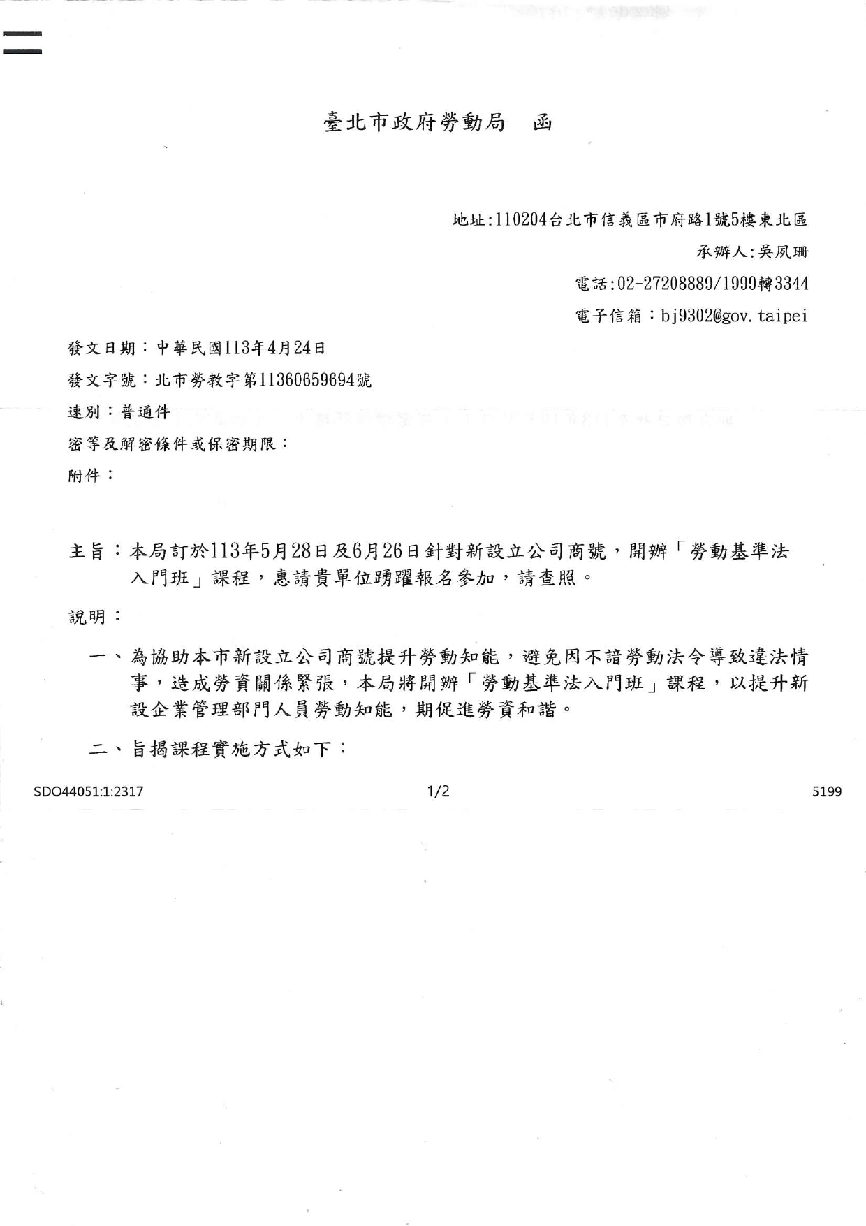 轉知臺北市政府勞動局北市勞教字第11360659694號函,勞動局訂於113年5月28日針對新設立公司商號,開辦「勞動基準法入門班」,轉知課程報名資訊,請查照。