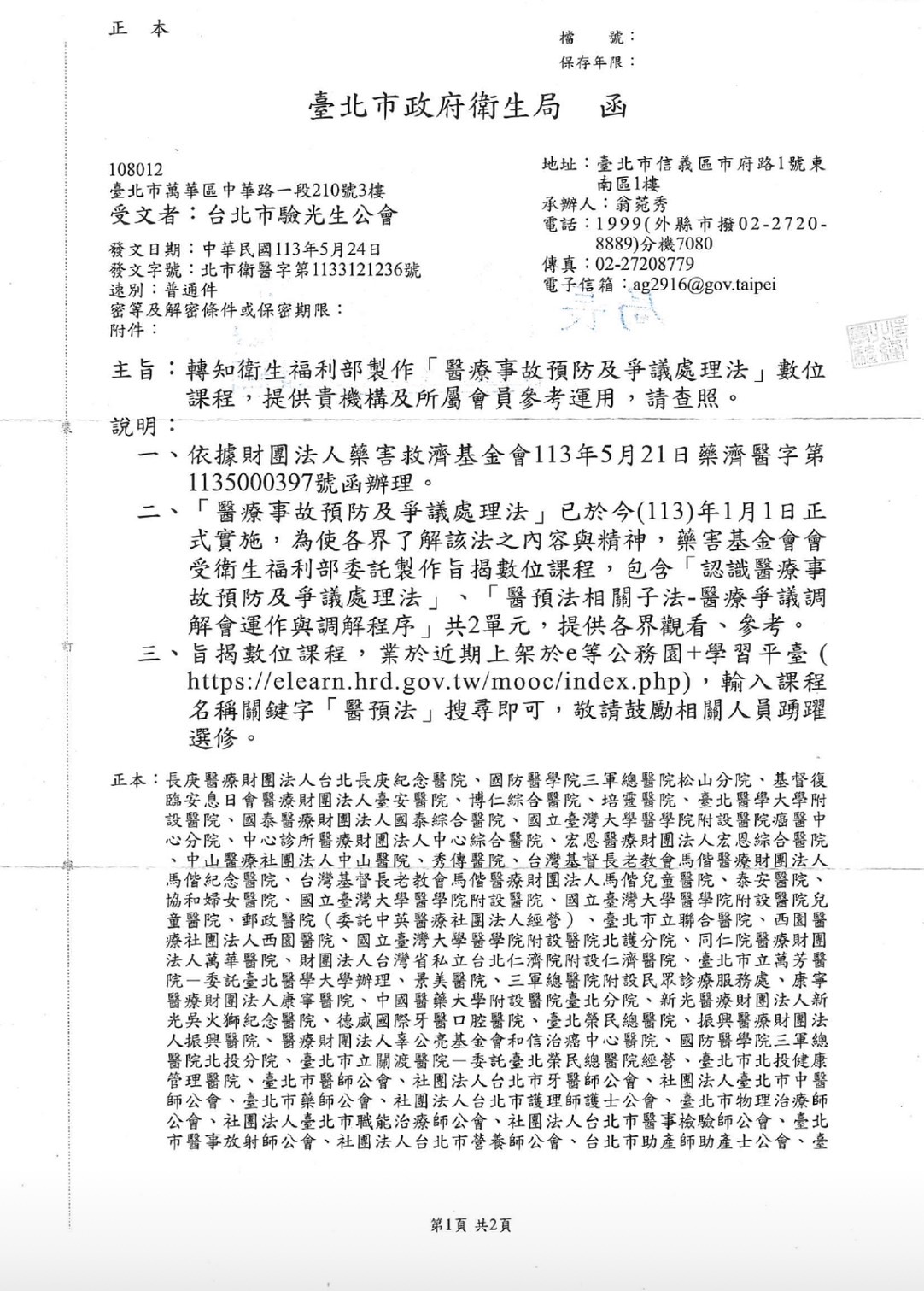 轉知北市衛醫字第1133121236號函,衛生福利部製作「醫療事故預防及爭議處理法」數位課程,提供貴機構及所屬會員參考運用,請查照。