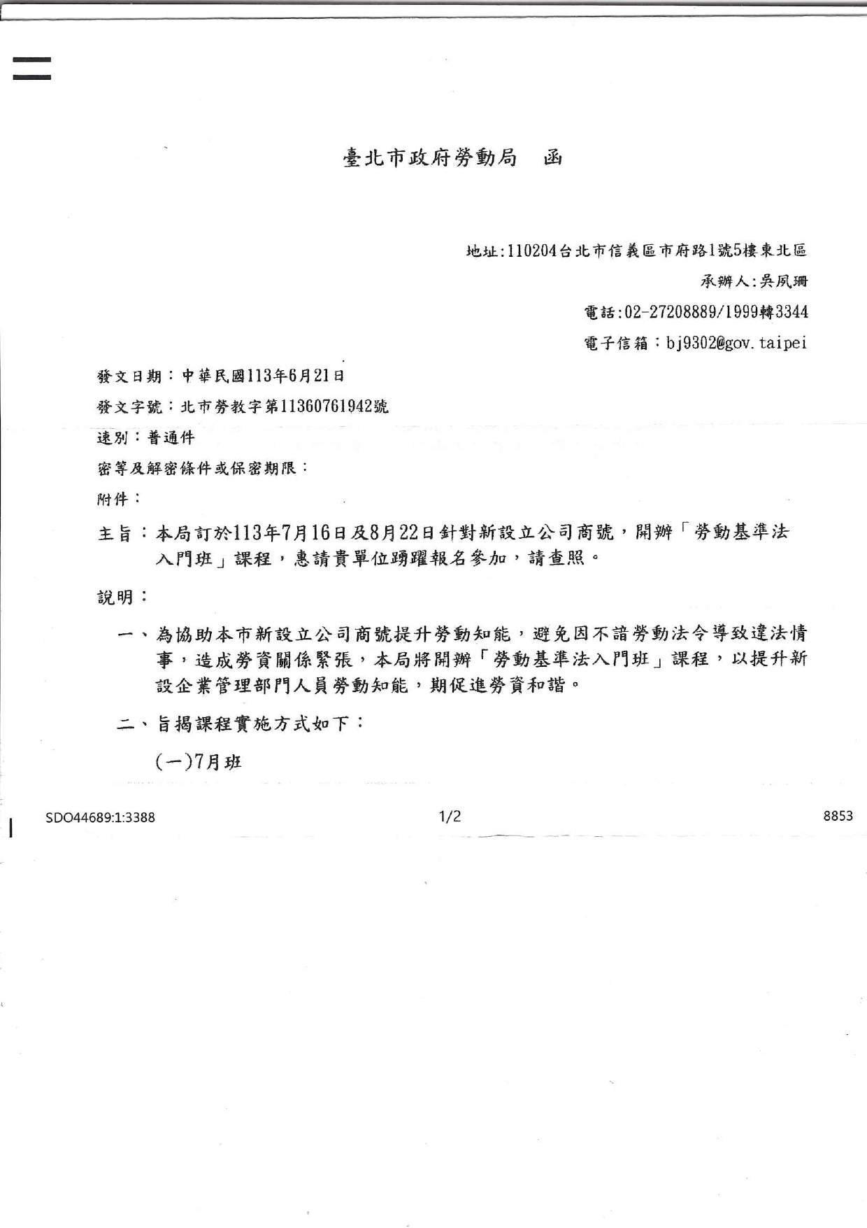 【會員通知】 轉知臺北市政府勞動局北市勞教字第11360761942號函,勞動局訂於113年7月16日及8月22日針對新設立公司商號,開辦「勞動基準法入門班」,轉知課程報名資訊,請查照。