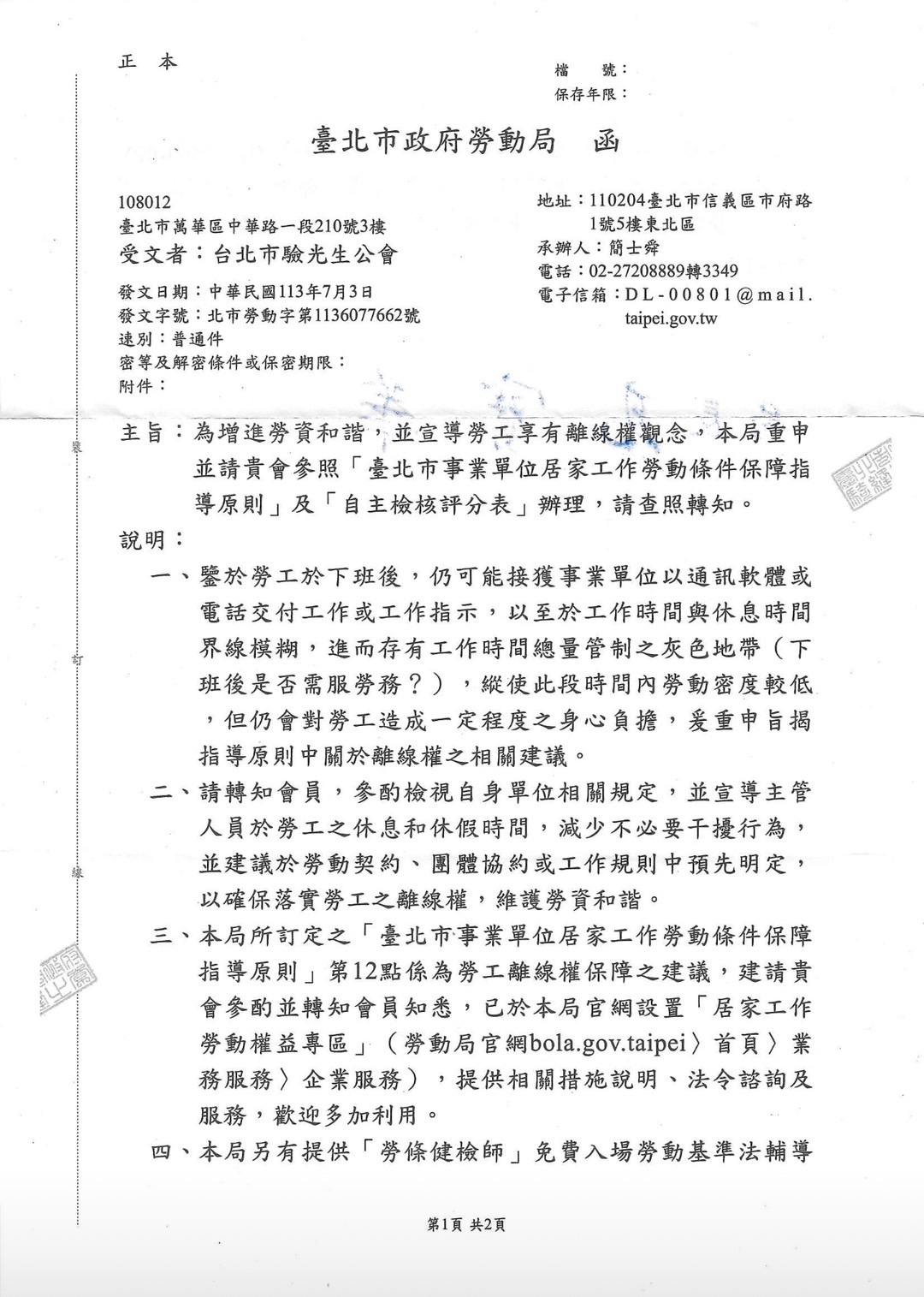 【會員通知】為增進勞資和諧並保障居家工作者勞動權益,勞動局訂定「臺北市事業單位居家工作勞動條件保障指導原則」及「自主檢核評分表」