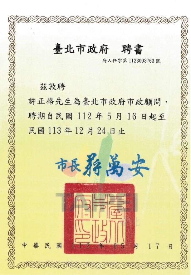 【訊息通知】本會許正格理事長獲聘為臺北市政府市政顧問,期盼未來能與地方主管機關以及菁英學界人士維持良好交流,為視光產業繼續努力。
