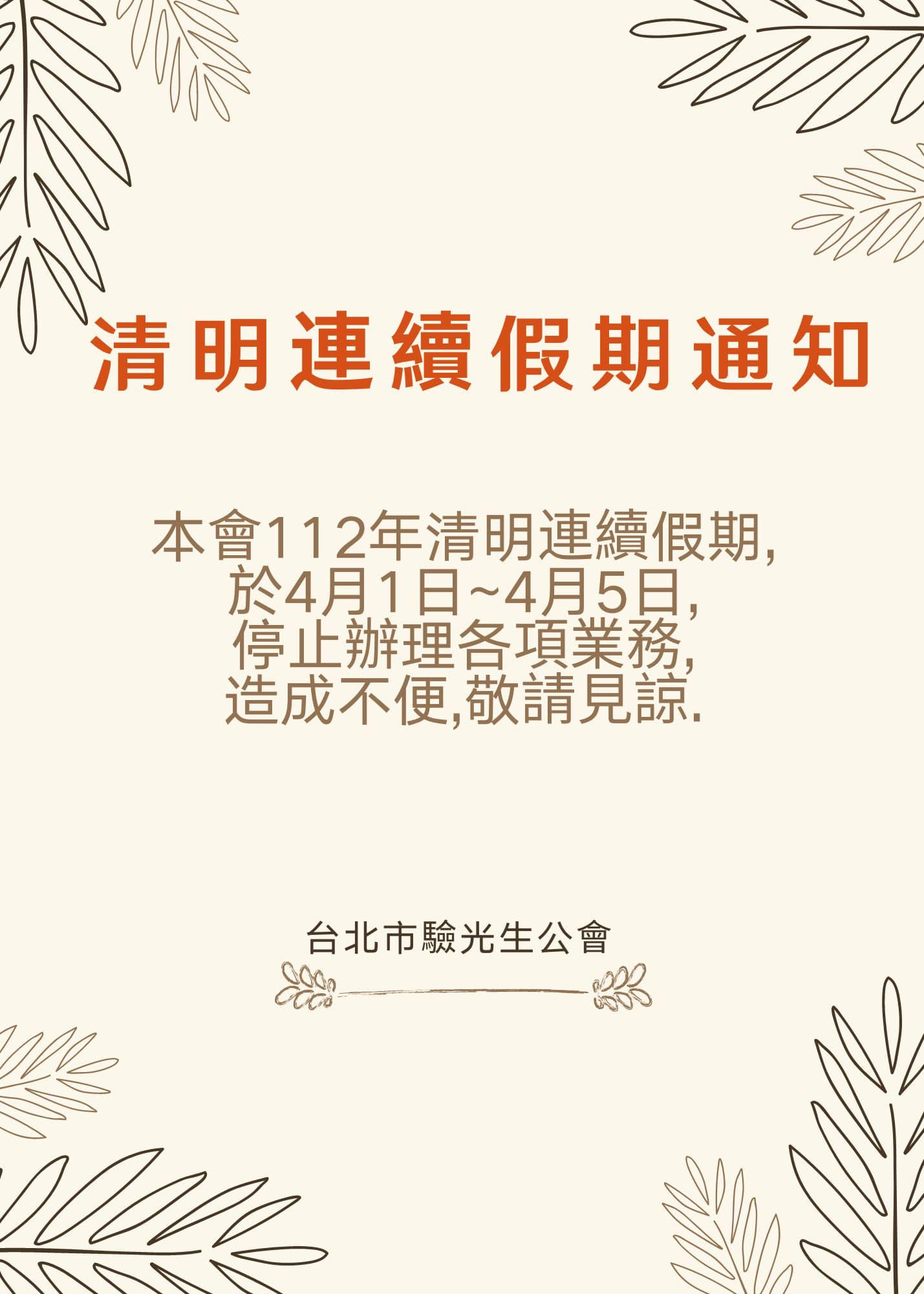 【會員通知】本會於清明連假期間4/1(六)~4/5(三),暫停辦理各項業務,不便之處,敬請見諒。
