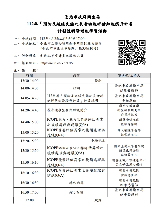【會員通知】衛生局訂於112年4月25日召開「112年預防及延緩失能之長者功能評估知能提升計畫」執行計畫說明暨增能學習活動